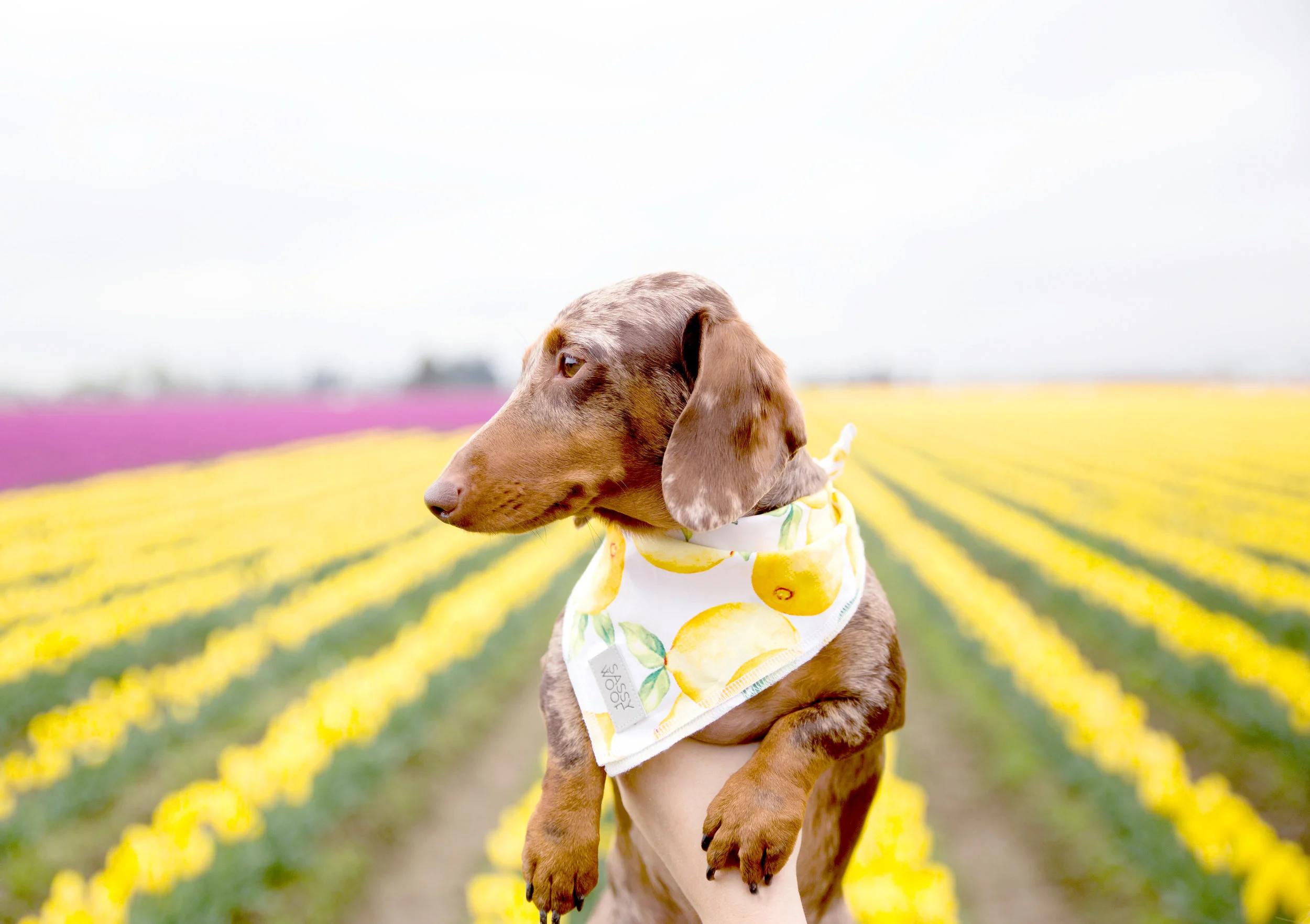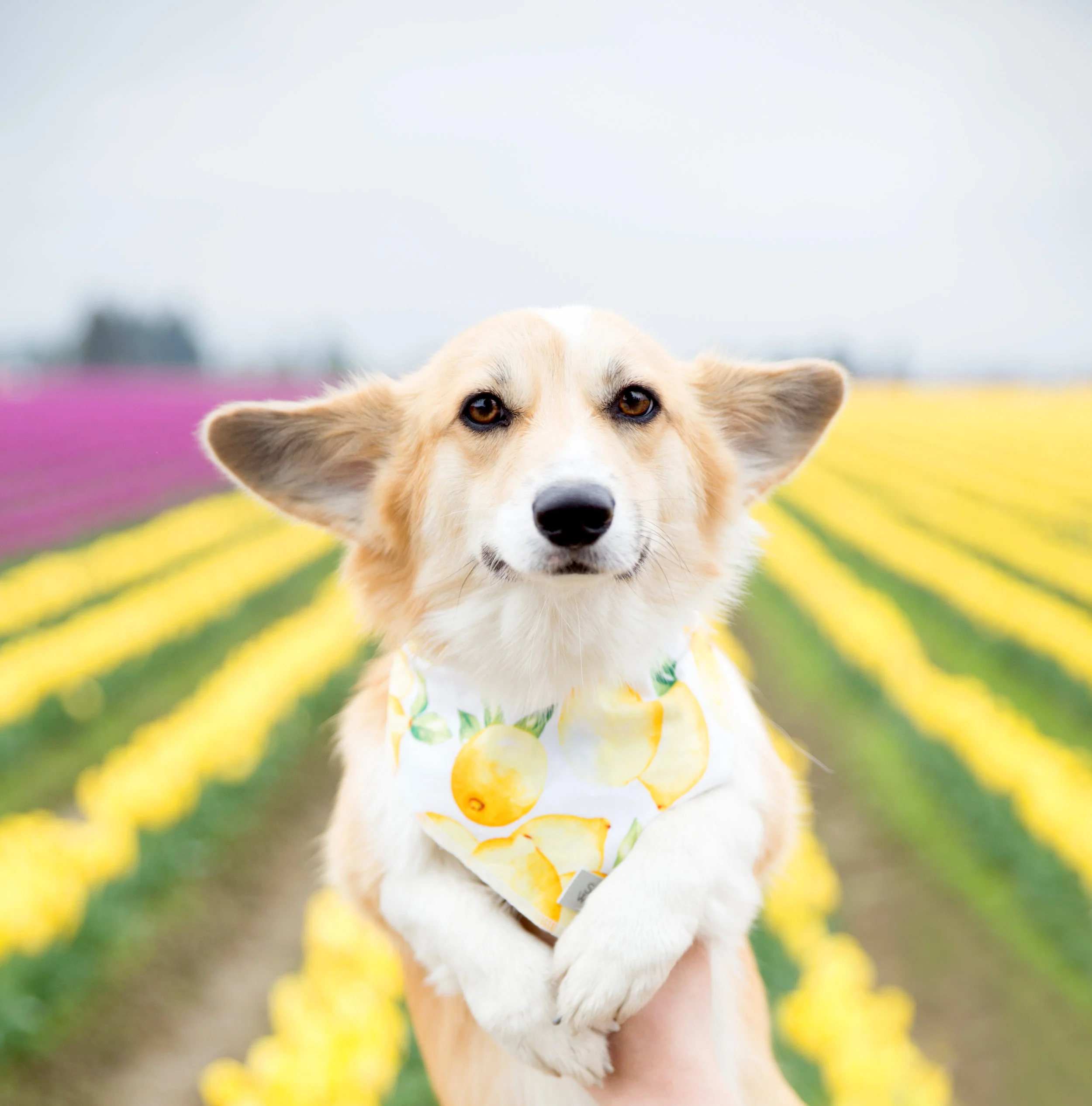 Lizzie at the Skagit Valley Tulip Festival wearing a bandana from Sassy Woof